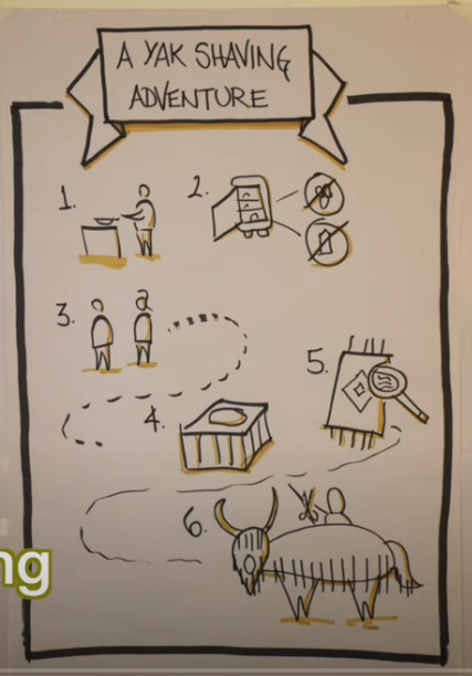 抽象的说,任何这样的流程的最后一步都是yak shaving,都是在动物园 剪牦牛毛以求给车打蜡一样滑稽,当然,这是正统的定义(“剪牦牛毛”是为了做某事,需要采取的一系列步骤中的最后一步Yak Shaving is the last step of a series of steps that occurs when you find something you need to do. “I want to wax the car today.)