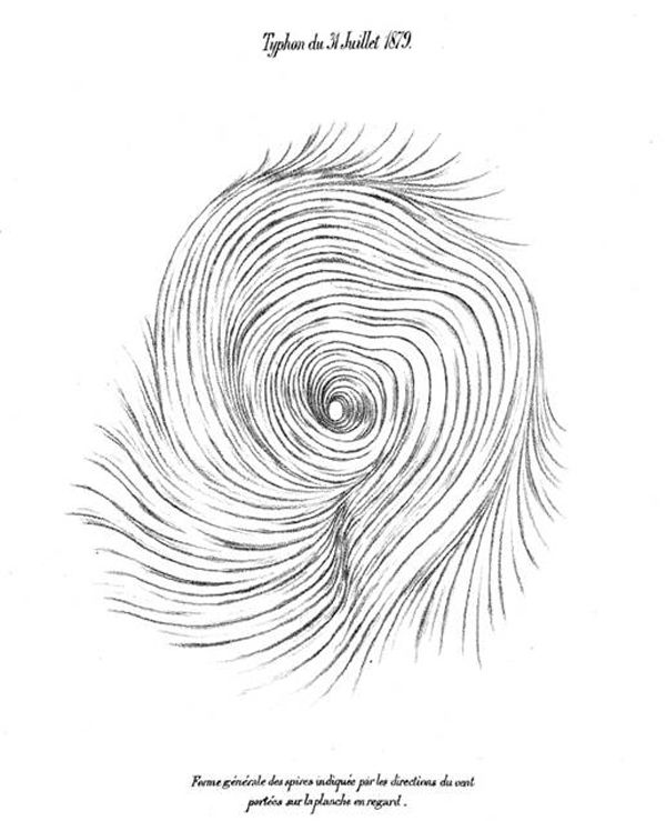 这张手绘图,记录了1879年7月31日一场台风的台风眼。 距今145年。作者是上海徐家汇观象台的第一任台长能恩斯(Marcus Dechcrens).