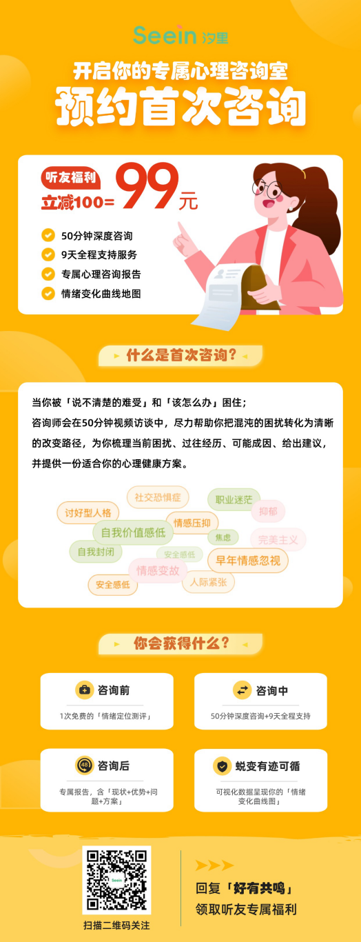 🌸搜索并关注「汐里心理」公众号,回复关键词【好有共鸣】,即可领取【199-100的首次咨询优惠券】,立享99元低价首次咨询福利~