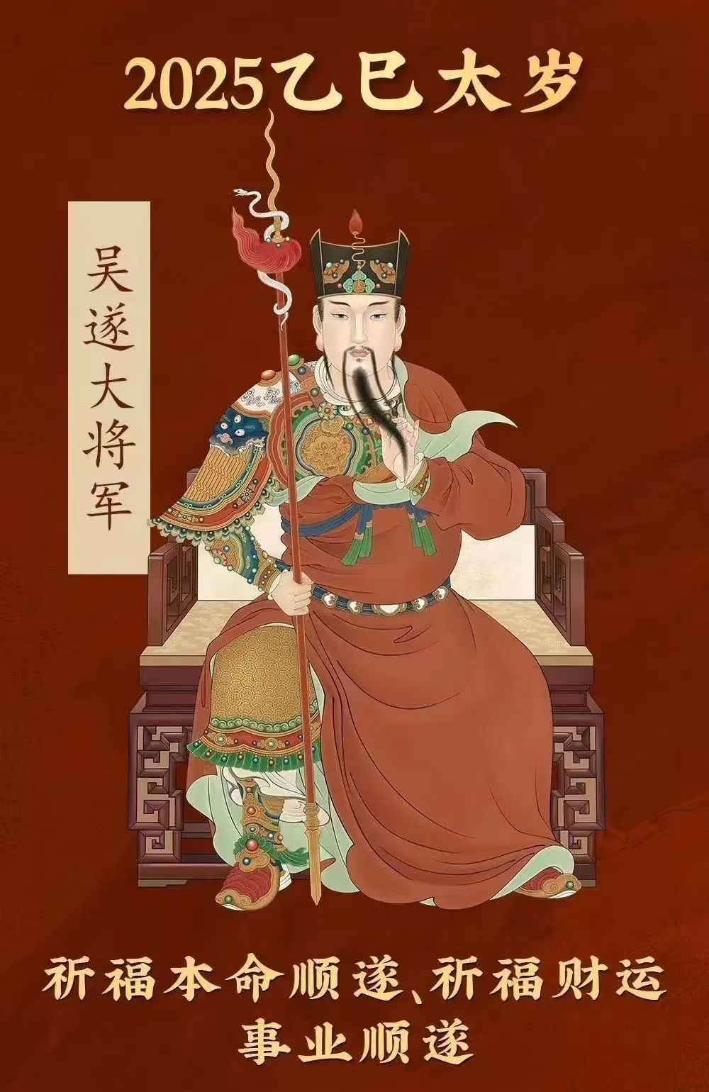 2025年的干支纪年为乙巳,值年太岁星君为吴遂大将军,值年太岁亦称本命太岁,掌管该年吉凶祸福。