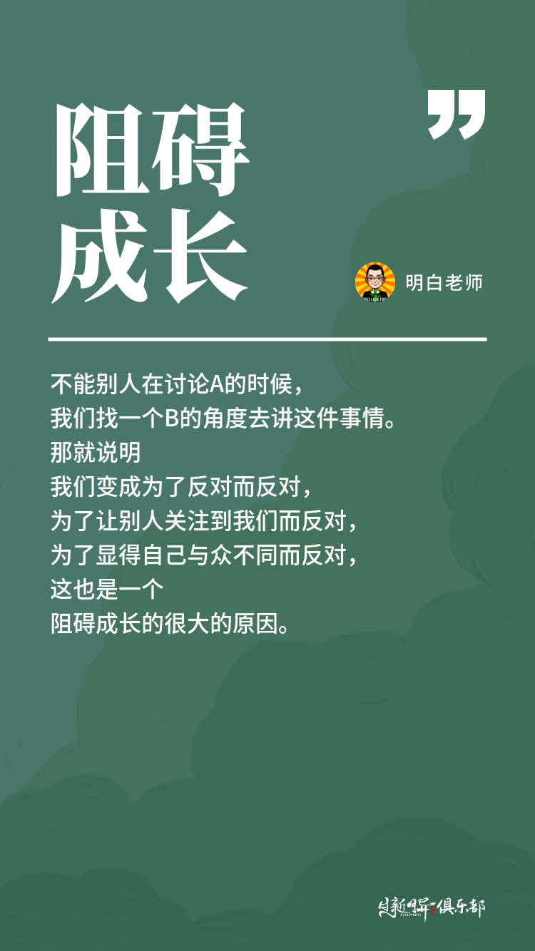 当然这个点放到我们自己身上,我们也不能用这种思维去讨论别人问题。不能别人在讨论A,我们找一个B的角度去讲这件事情。那就说明我们也会变成为了反对而反对,为了让别人关注到我们而反对,为了显得自己与众不同而反对,这也是一个阻碍成长的很大的原因。