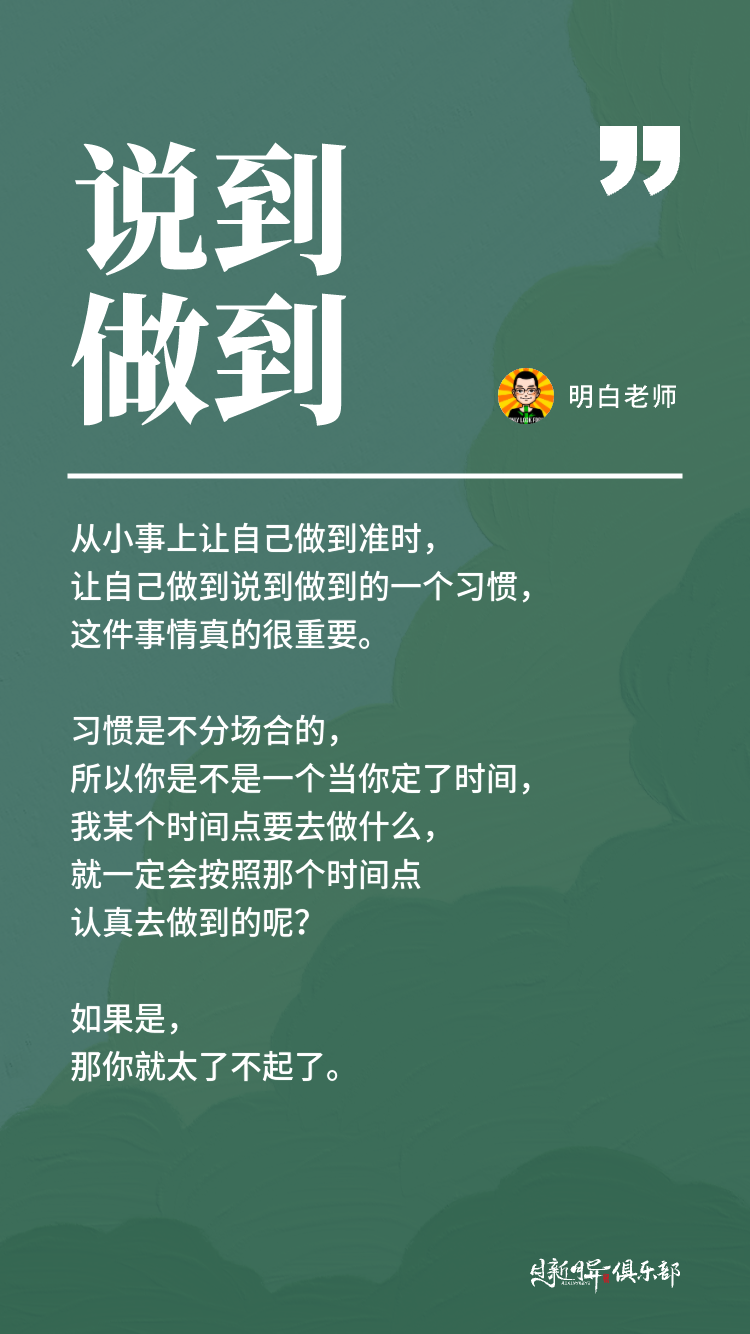 所以从小事上让自己做到准时,让自己做到说到做到的一个习惯,这件事情真的很重要。习惯是不分场合的,所以你是不是一个当你定了时间,我某个时间点要去做什么,就一定会按照那个时间点认真去做到的呢?