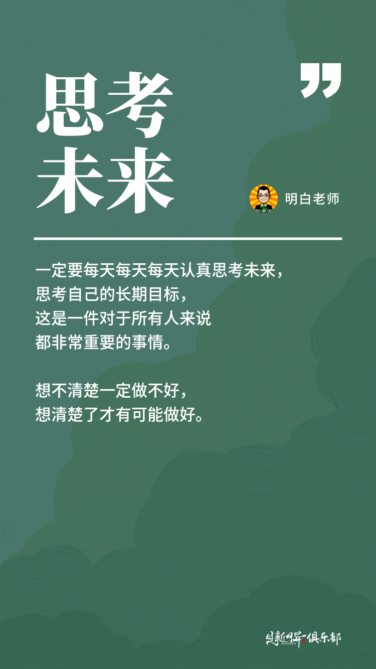 所以一定要每天每天每天认真思考未来,思考自己的长期目标,这是一件对于所有人来说都非常重要的事情。想不清楚一定做不好,想清楚了才有可能做好。