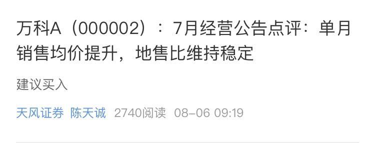 我在文稿中放了一张图片,图片显示的是某地产公司的研报。这家地产公司正是万科。研报中大概包含以下几点信息:首先是标题,标题中写明了是关于哪些内容的研究报告,图中的标题是《万科A,7月经营公告点评》。看到标题你也就明白了研报的分析方向。然后就是正文内容,这个没必要解释太多....具体的分析内容和依据都会写在文章正文。接下来是研究员给出的评级,评级就等同于评分,大概分为五种:买入评级,增持评级,持有评级,减持评级,卖出评级。
