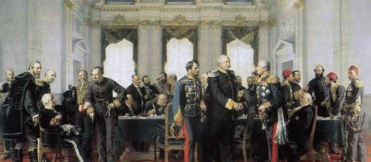 1870年,法国以“西班牙王位继承问题”为借口,向普鲁士宣战,史称“普法战争”。这一次,南部的巴伐利亚等邦国因反法情绪高涨,选择站在普鲁士一边。普鲁士军队势如破竹,仅用两个月就包围了巴黎,法国皇帝拿破仑三世被俘。1871年1月,普鲁士国王威廉一世在巴黎凡尔赛宫镜厅加冕为“德意志皇帝”,德意志帝国正式成立。