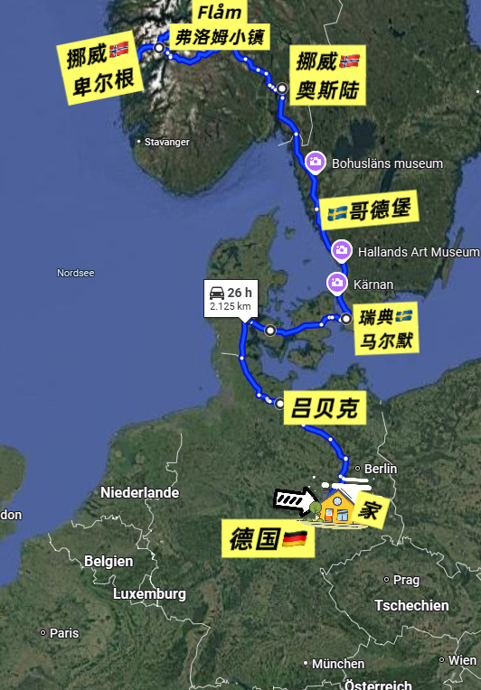 首先是我们的线路图:德国中部出发- 途径北部城市吕贝克-到瑞典城市马尔默-再到挪威首都奥斯陆-继续开往挪威缩影之路中的Voss小镇-Flam 做峡湾游船-最后到挪威第二大城市Bergen卑尔根