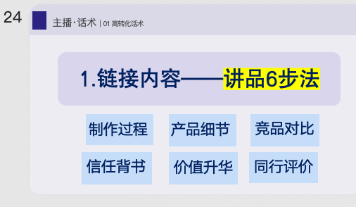 11:27 直播话术的第一部分,我命名为“讲品6步法”,这里面的总结的话术内容需要逐一在你的直播间叙述,解决你直播张不开嘴的问题