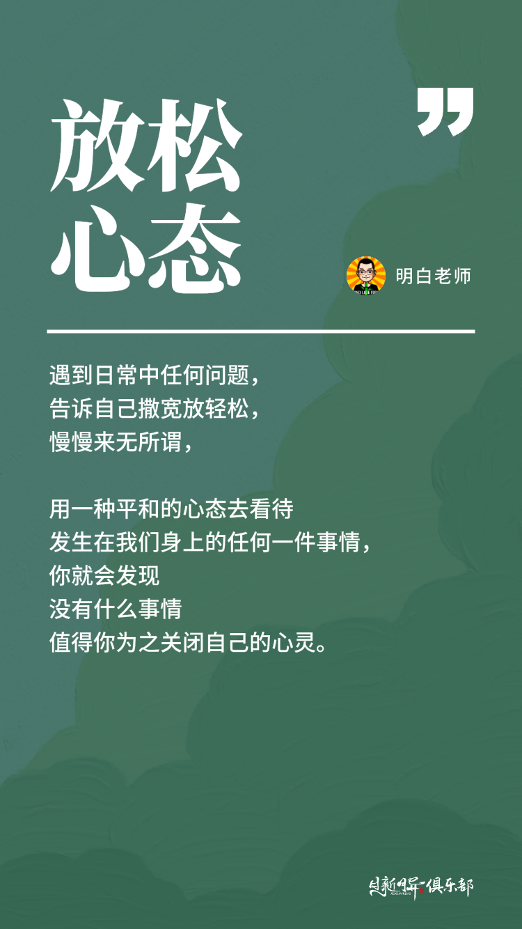 所以遇到日常中任何问题,告诉自己撒宽放轻松,慢慢来无所谓,用一种平和的心态去看待发生在我们身上的任何一件事情,你就会发现没有什么事情值得你为之关闭自己的心灵。