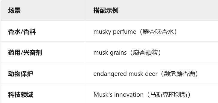 -musk 麝香/麝香鹿;专有名词:姓氏(Elon Musk)
