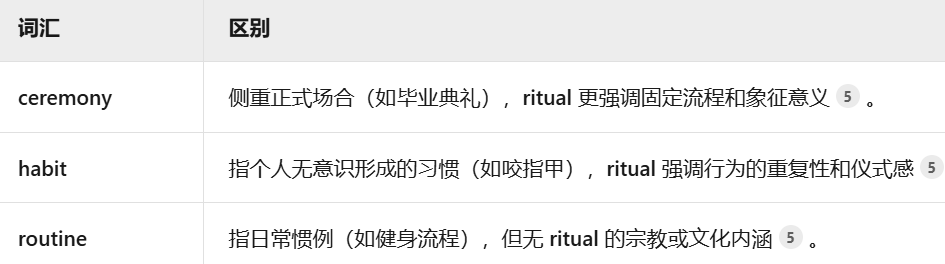 -ritual 宗教/传统仪式:指按固定程序进行的宗教或文化典礼(如祭祀、祈福)