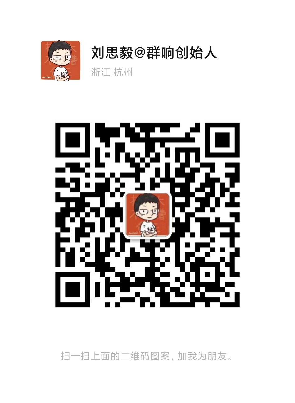 刘思毅:公众号「群响刘老板」,群响创始人,每天访谈1位年入 100 -1000 万的年轻创业者、日更原创文章 2000 天,和100万年轻创业者一起成长的男人。