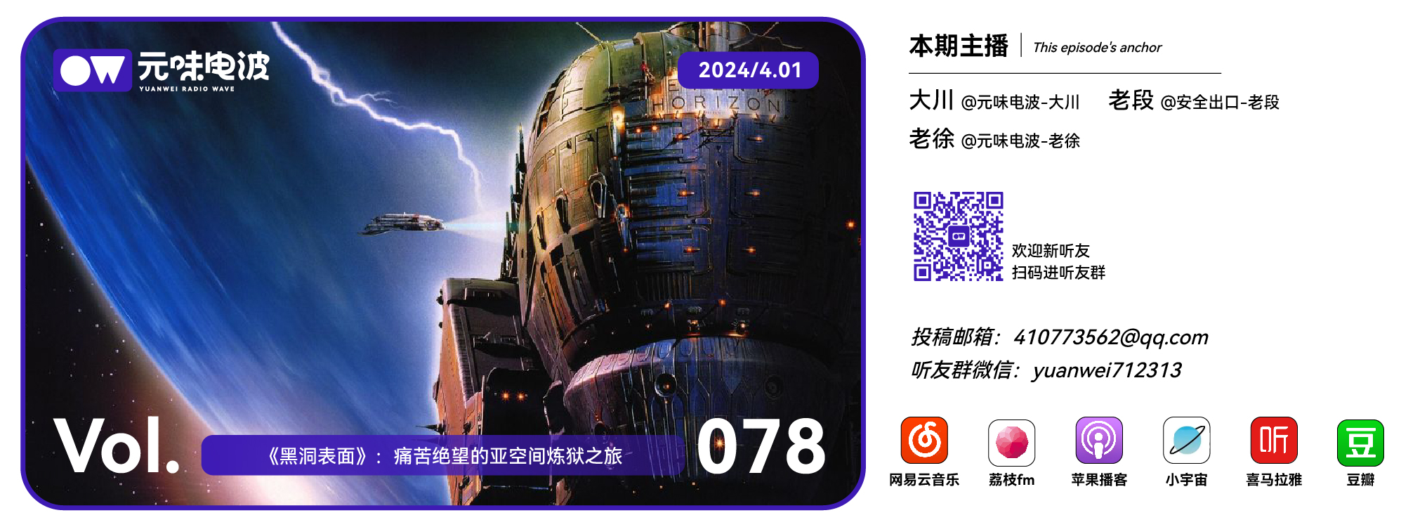 我们的节目,您可以在小宇宙、喜马拉雅、网易云音乐、荔枝 FM、荔枝播客,苹果播客,豆瓣书影音搜索「元味电波」来订阅、收听。如果喜欢我们,也可以分享给你身边的朋友!