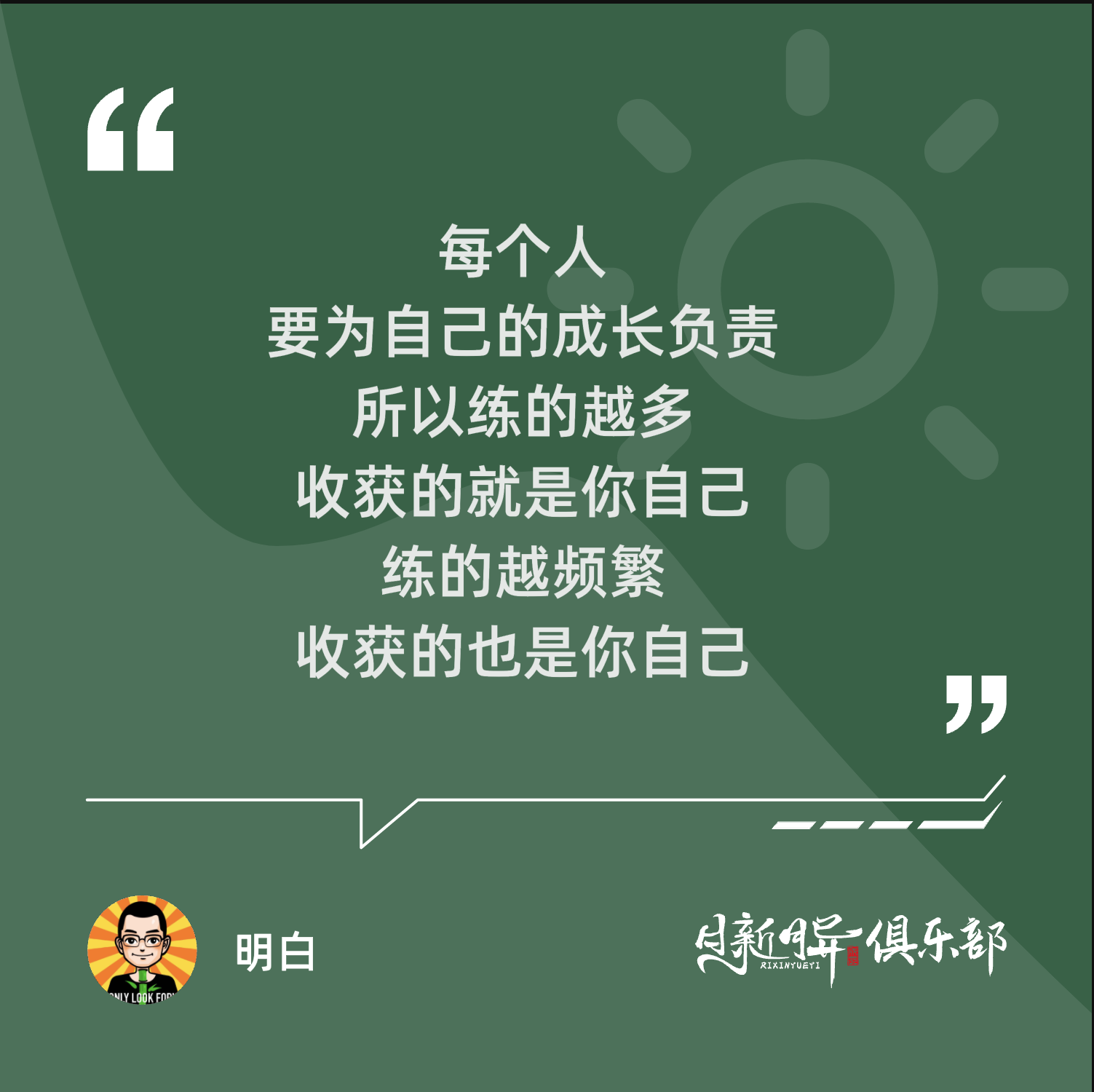 每个人要为自己的这个成长负责,所以练的越多,收获的就是你自己,练的越频繁,收获的也是你自己,而不是我们。