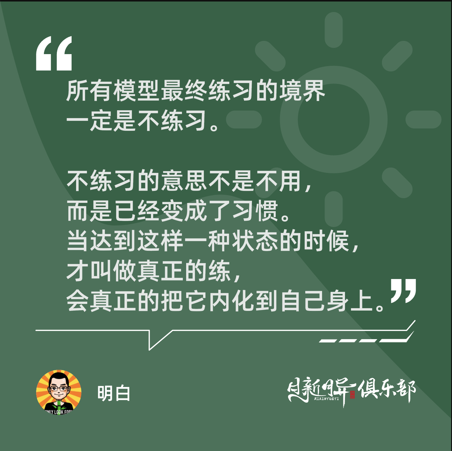 最终有一个理想的状态,那就是你把这个模型变成了习惯,你不需要再练习了,因为你时刻都在练习。