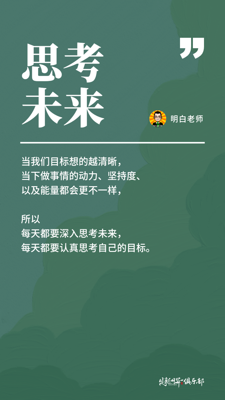 当我们目标想的越清晰,当下做事情的动力、坚持度、以及那种能量都会更不一样,所以每天都要深入思考未来,每天都要认真思考自己的目标。