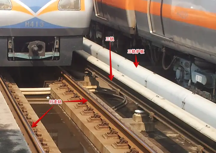2号线铁轨,右侧靠墙清晰可见覆设绝缘罩的第三轨,远离站台