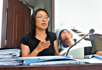 孟朝红在法庭上展示第一次见到儿子尸体时拍摄的照片,可见右下颌伤口
