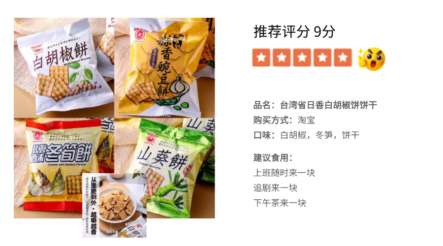 第一款是来自台湾省的日香白胡椒饼,有点像小时候吃的那种混合装的蟹味酥的小饼干,酥脆的口感非常过瘾