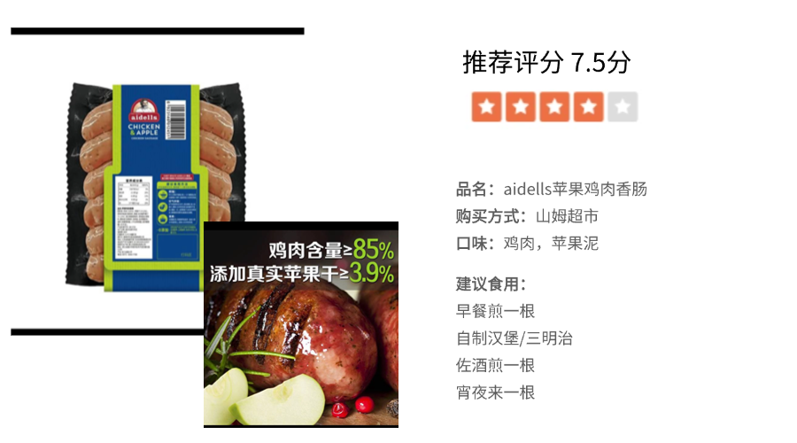 这一款是来自山某的烹饪香肠,非常有意思的甜口香肠,带着颗粒感的苹果果泥,鸡肉和果泥糅杂在一起有汁水丰富的香甜感。