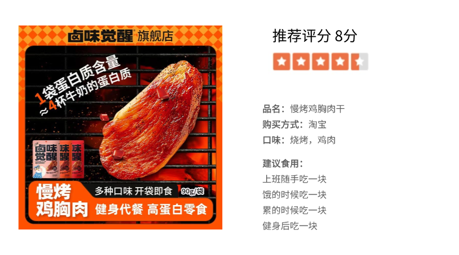 适合减脂人群吃的宵夜零食,鸡胸肉烤的非常到位,不会很干涩,汁水很丰富,肉又很入味,有一点点辣度