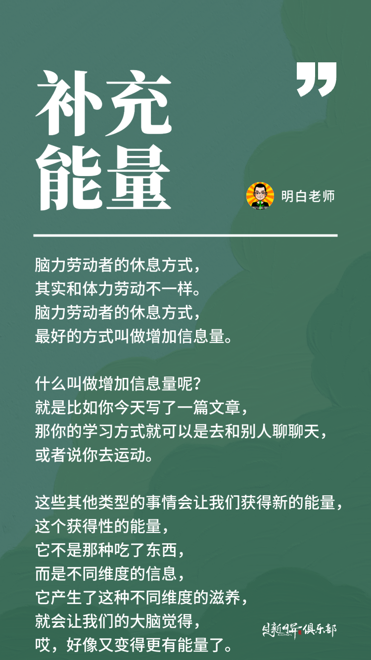 他说,脑力劳动者的休息方式,其实和体力劳动不一样,像体力劳动你的能量消耗了,那你就补充能量。你可以是吃东西,也可以是躺着休息,它就能够让你变得更有精力。