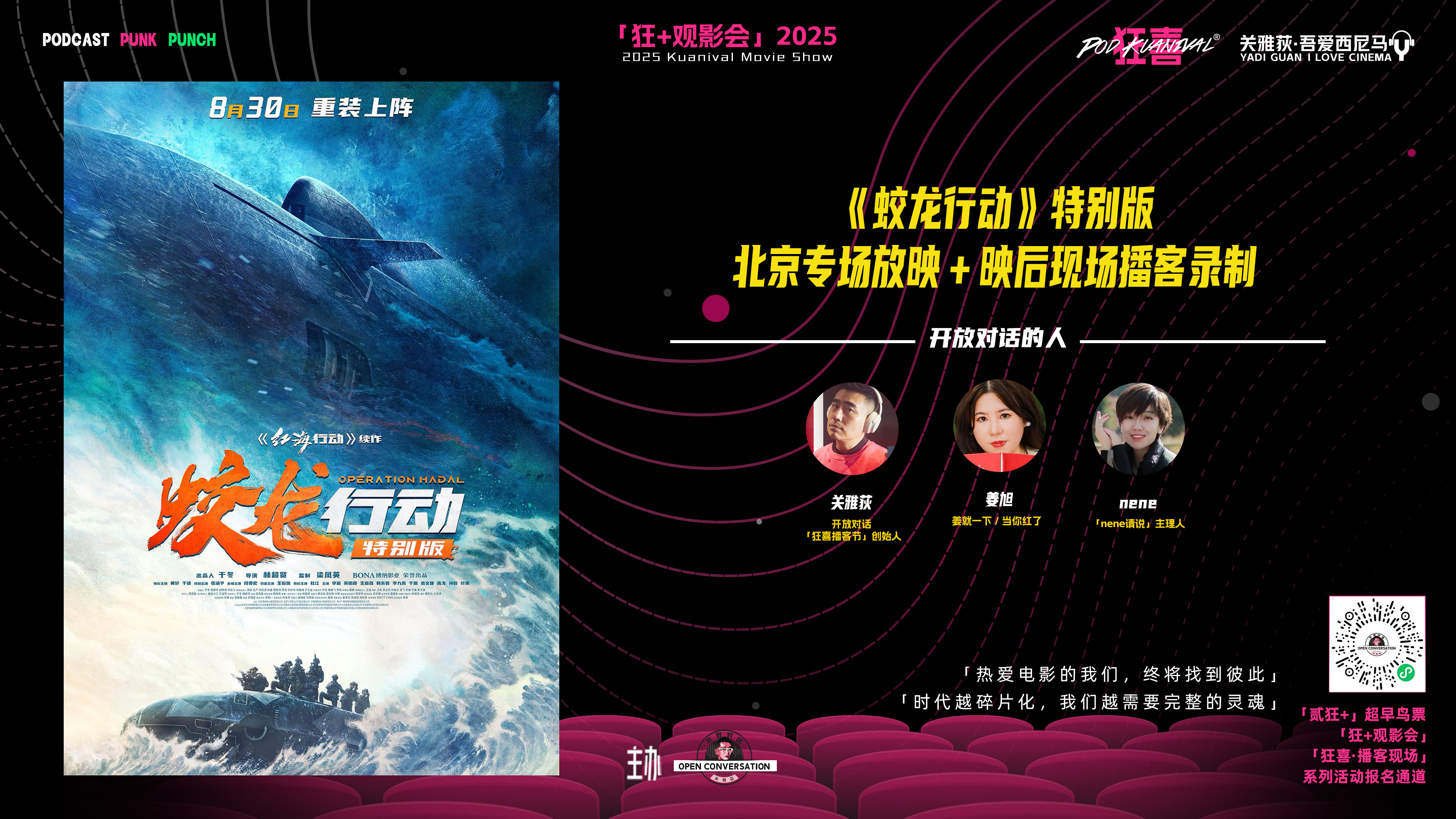 「狂+观影会」Kuanival Movie Show,是聚焦国内院线公映电影的90分钟长映后线下开放对话播客录制活动。「狂喜·播客现场」Kuanival Arena,线下、面对面的「思想竞技场」,与「狂+观影会」同为「狂喜播客节」分支活动。