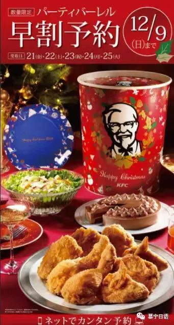 当肯德基于1983年推出「パーティバーレル」(即全家桶)之后,这种有炸鸡、副餐还有蛋糕的组合,便成为圣诞节必备。直到今天,早在圣诞节的“前两个月”,就有人开始预订圣诞的炸鸡,卷得不行!