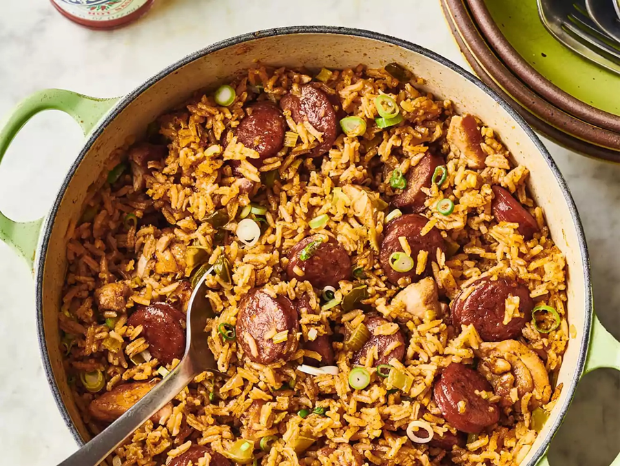 食材:花生油,安杜耶香肠,鸡胸肉,卡真调料、新鲜蒜末、红辣椒碎、盐、黑胡椒、辣酱、伍斯特酱和菲利粉(带辣味的香料)调味,洋葱,芹菜,青椒,白米,鸡汤
