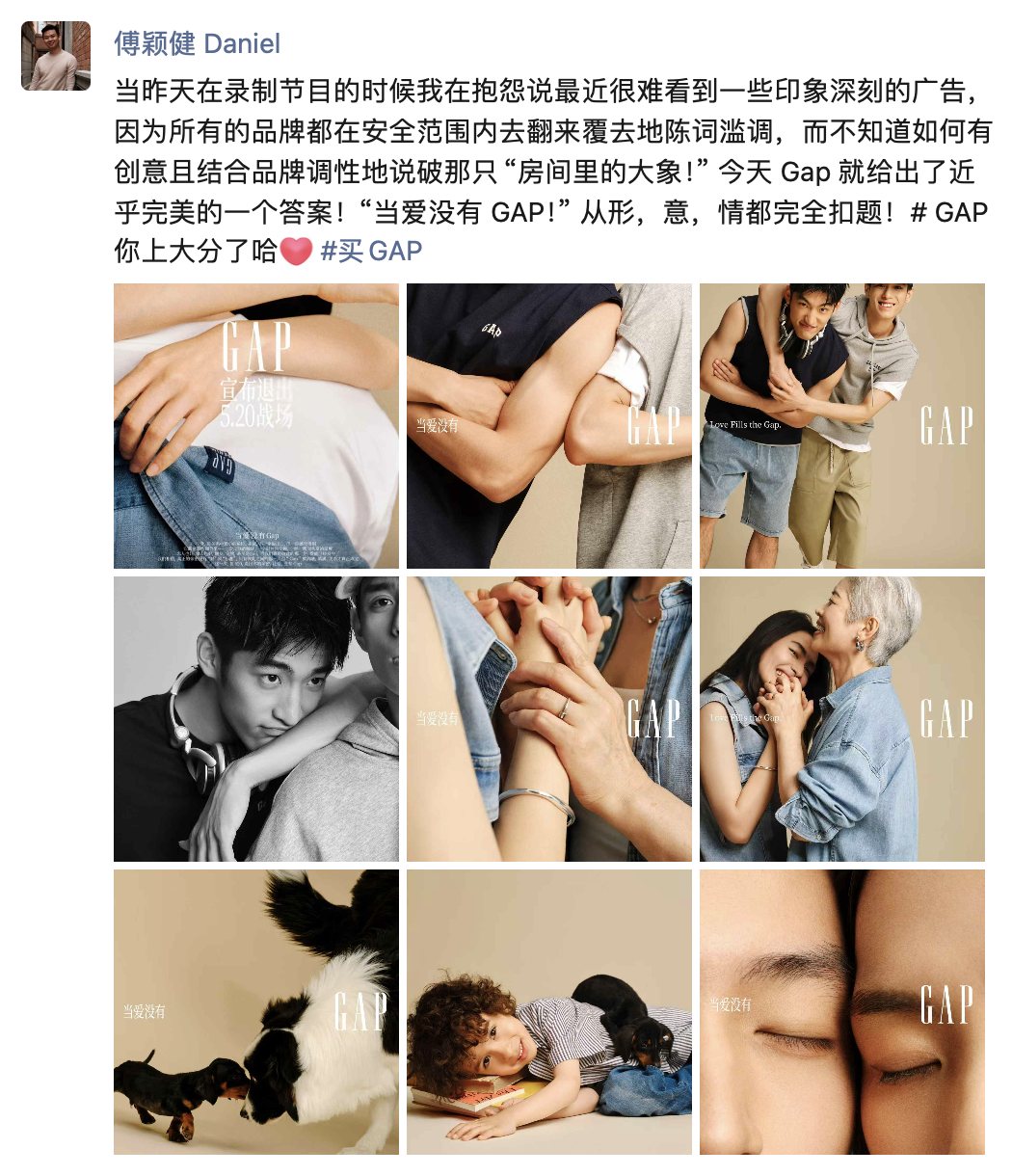 傅颖健 Daniel:GAP 520 的主题是:当爱没有 GAP,主动宣布退出 520 的营销战场,以退为进。因为品牌相信,真正的“亲密”,无法用“正确”和“标准”来定义。家人也好,朋友、宠物甚至自己,当我们彼此靠近的那一刻,爱就已经发生了。传播大片更是延续了 GAP 一直以来,温暖、轻松、运动 Chic 的质感,把能够代表品牌画像的人群,一对一对地放进来,文案也是写得非常精妙,让人看了以后是一看再想看。