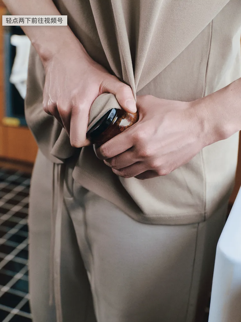 比如你做饭时顺手擦手、拧瓶盖;你跟女朋友出去走路,羽绒服可以盖在她身上,就像被子一样;衣服不需要太复杂,它就是陪你过日子的东西。