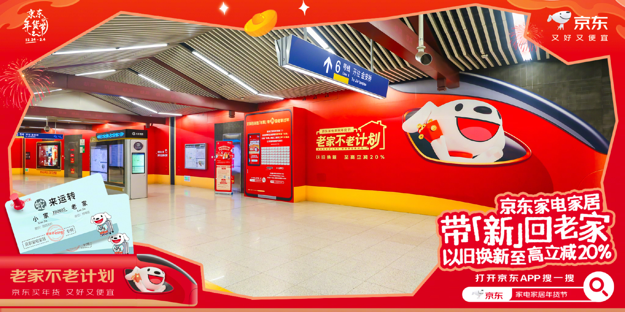 接下来是京东家电家居的「老家不老计划」。年轻一代总被新鲜的事物包围着,而老家可能还停留在原地。为此,京东在北京6号线南锣鼓巷地铁站内打造了一辆「老家不老专列」,将老家的全新样貌以互动的形式呈现在大众面前。用户站在互动大屏前挥挥手,就能看到老家的旧貌新颜对比,同时扫码还能定制专属姓氏谐音梗车票,生成一张属于自己的专属车票。年货节期间,京东还邀请广大消费者晒出自己的老家,分享与老家的感人故事,鼓励大家通过家电家居的焕新升级,让老家焕发新的生机与活力,展现「老家不老」的新面貌。这一活动不仅唤起了人们对老家的思念,也推动了家电家居产品的销售,改善了老家的居住环境。
