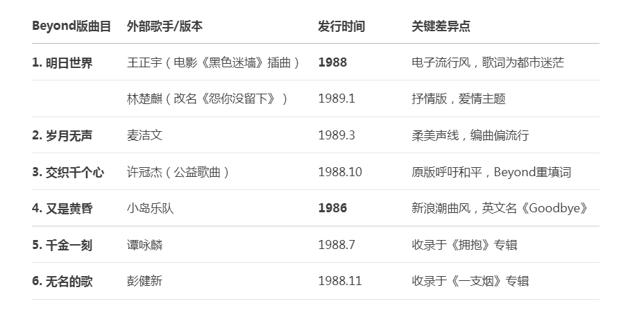 说下《午夜怨曲》,叶世荣作词,黄家驹作曲,当年被收录在周润发的贺岁电影《吉星拱照》里作为插曲,这首歌到现在也是非常的受欢迎,尤其粤语版本,国语版歌词是刘卓辉写的,里面有一句是:“我不想看见热诚的希望,仿佛马不停蹄的忧伤”。这句歌词显得很懒惰,因为1988年,黄舒骏刚发表他的第一张专辑《马不停蹄的忧伤》.....我总觉得,虽然Beyond发行了很多国语专辑,但因为歌词在一般情况下都是套用了粤语歌词的框架,加上四个成员当时的国语发音实在无法让人接受,所以这个系列选择是粤语专辑。说到歌词,这张专辑里的《又是黄昏》非常不错,尽管很多人都在指责Beyond的老板、经纪人陈健添,不管他人品怎么样,他写的这首歌的歌词,是整张专辑的一个亮点,和编曲旋律配合的刚刚好:街灯、车辆、都市,但也有海角、天空和晚风。每每听这首歌,都会有一种奇特的末日世界里的感觉。