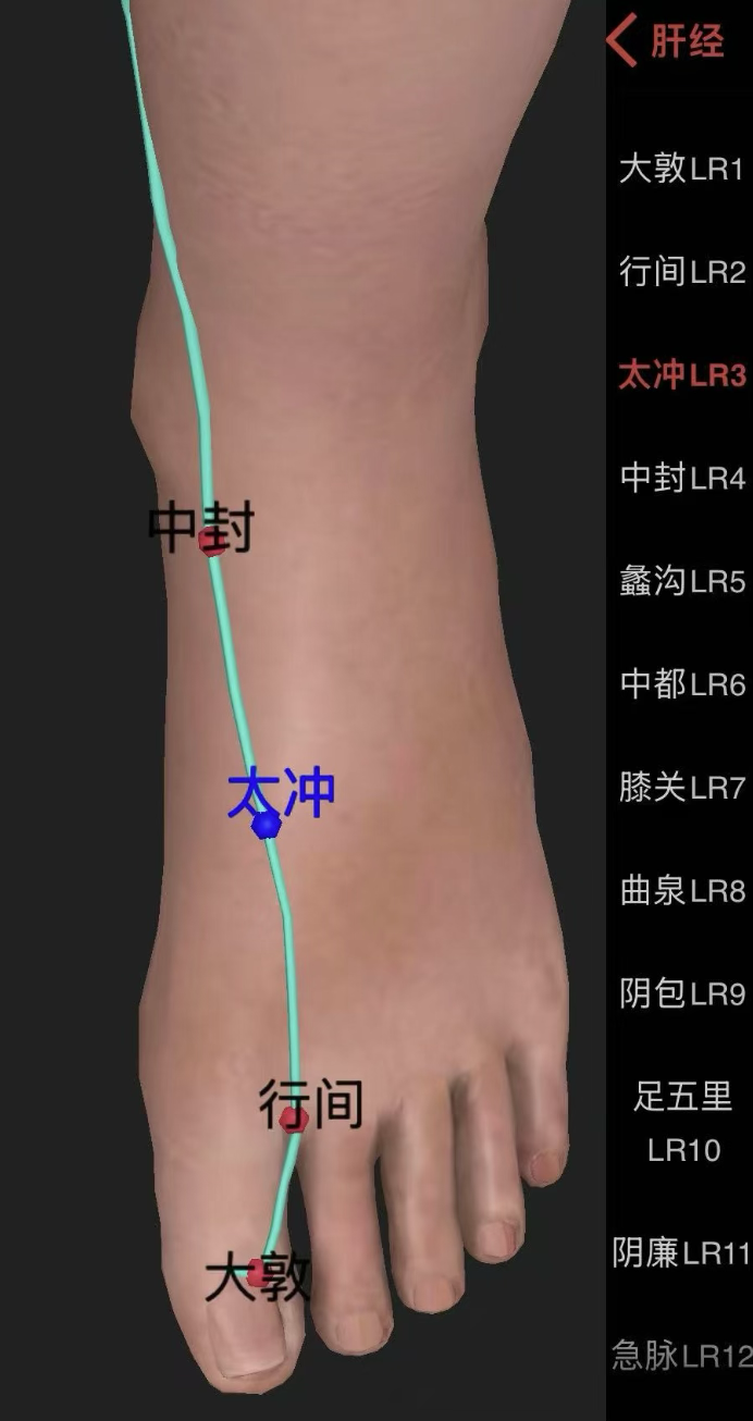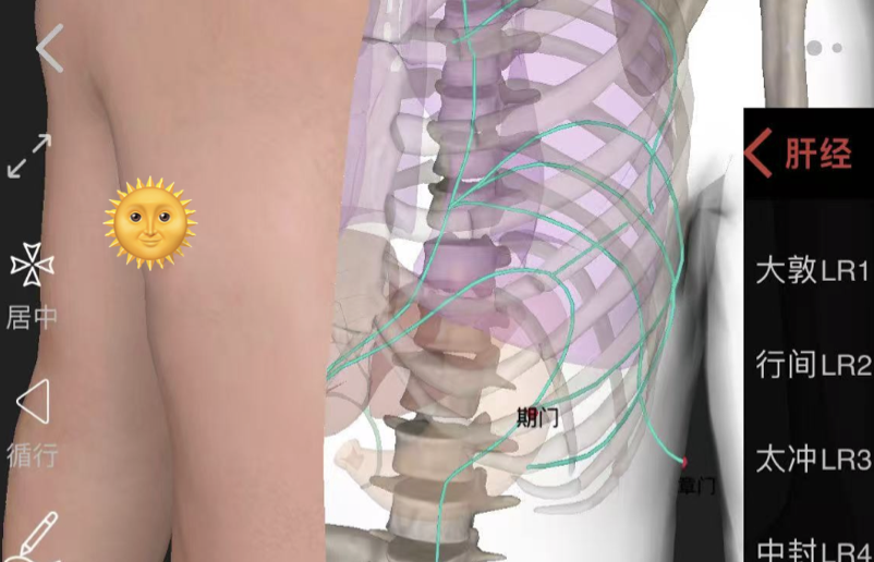 经络分布图可以参考app:3Dbody解剖的经络穴位免费频道,点击右下角【肝经】就可以查看了注意,肝经穿行于胁肋部,透明模式下,去皮才可见。