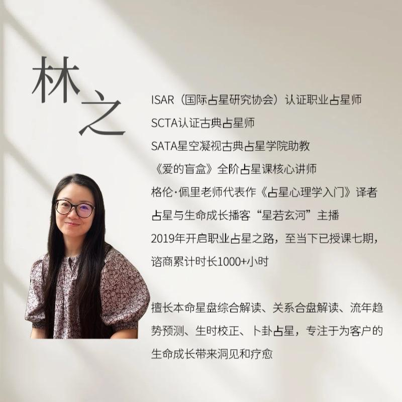 师从林之老师(ISAR认证职业占星师、SCTA认证古典占星师),深入研究星座原型、宫位结构与心理模式