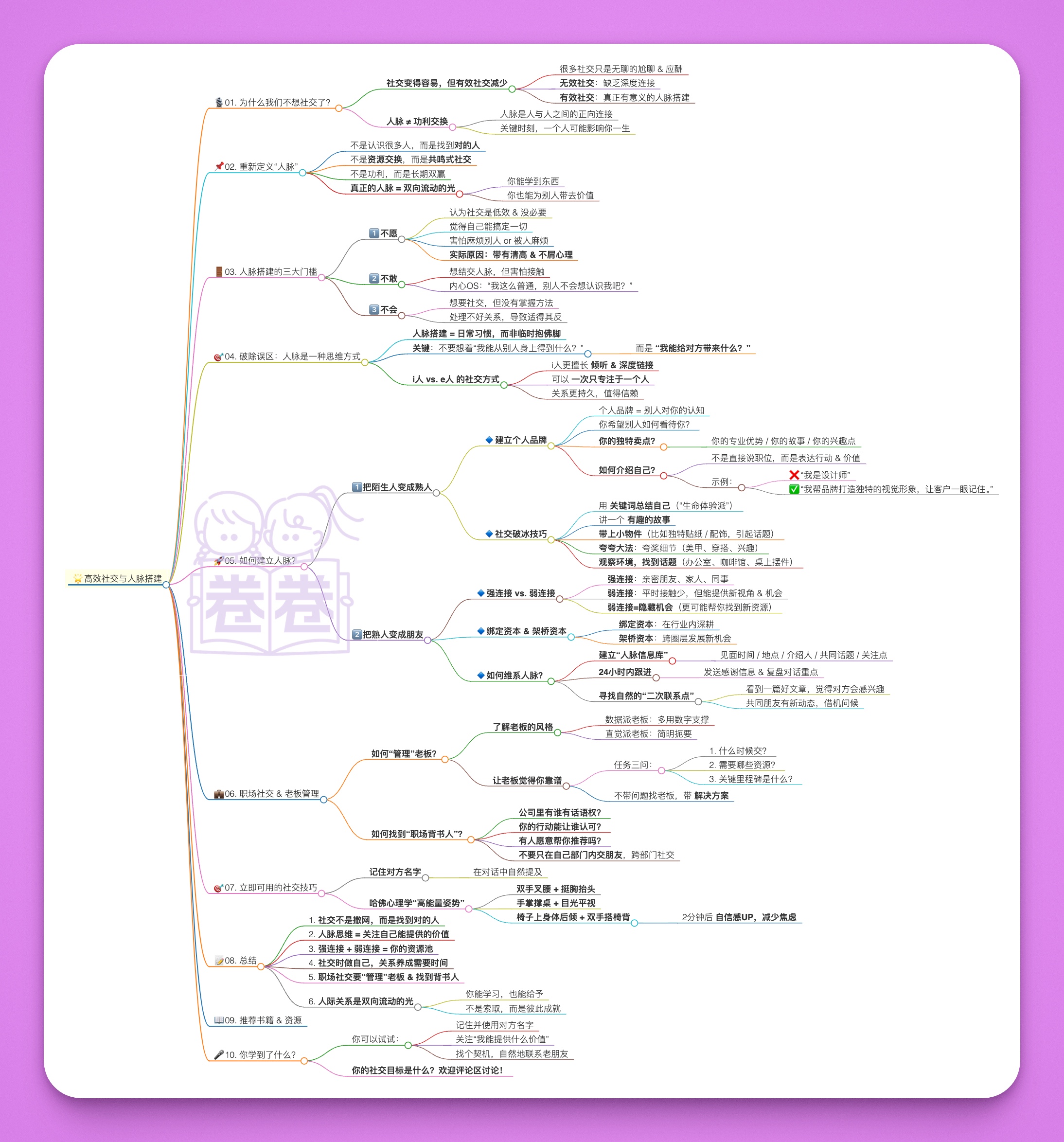 - 建立人脉的思维方式:日常化、利他化、价值导向,用“我能提供什么”代替“我能得到什么”