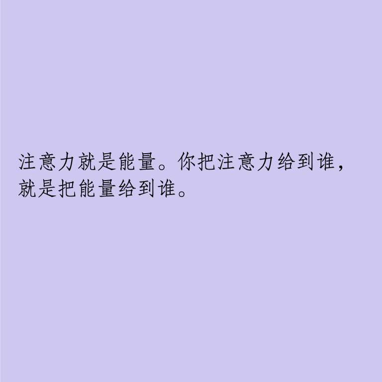今天想聊聊关于生活里细碎的负面念头,怎么调频,怎么转向。我们知道意识是一种非常强大的力量,当你把意识集中,它会更加充满力量,你给一样东西关注的越多,你感受到的对应的情绪就越强,可以说,注意力就是能量,你给谁注意力就是把能量给了谁。当你翻看着朋友圈,发现,哇她找了个好工作,他们全家又出国旅行了,如果你意识到自己体验到的是不安和嫉妒,它会进一步变成恐惧和羞愧,觉得自己怎么这么废柴,一事无成,什么都没有 —— 这时候,请即刻放手,收回你的注意力,收回你投射出去的能量,当你觉得心念上出现了这种难以言说的紧张感,那就放手吧。