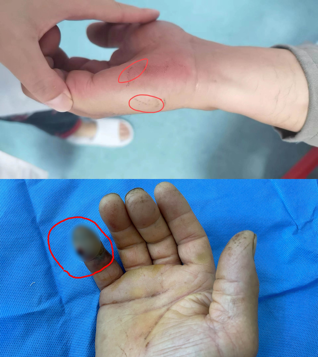 上图:无毒蛇咬伤口。下图:毒蛇咬伤口。供图:金艳新