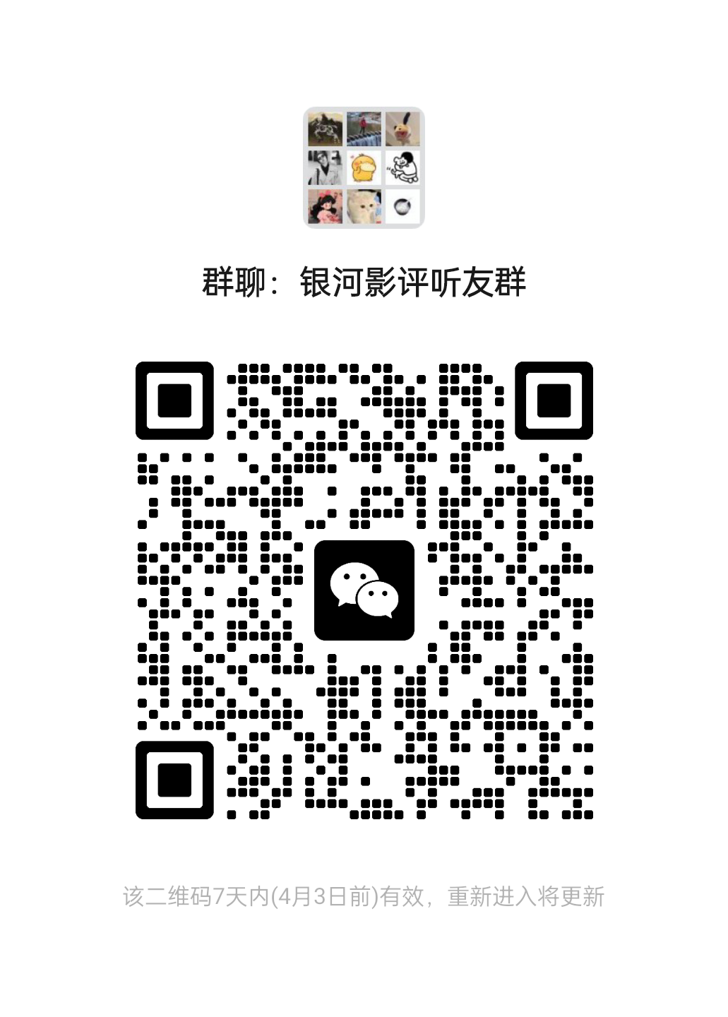 - 欢迎大家扫码添加银河影评听友群,或添加我的个人微信timelesschen(添加个人微信请备注“小宇宙听友”,不然无法通过)