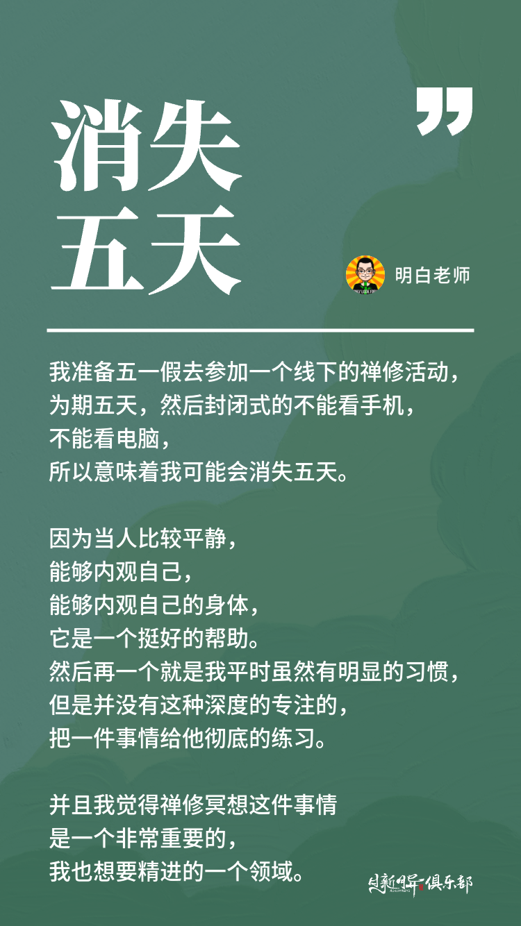 然后因为今天29 号,明天 30号,后天就放五一假了。然后我也准备五一假去参加一个线下的禅修活动,为期五天,然后式的不能看手机,不能看电脑,所以意味着我可能会消失五天。那昨天我才刚刚分享过禅修,为什么没有用?