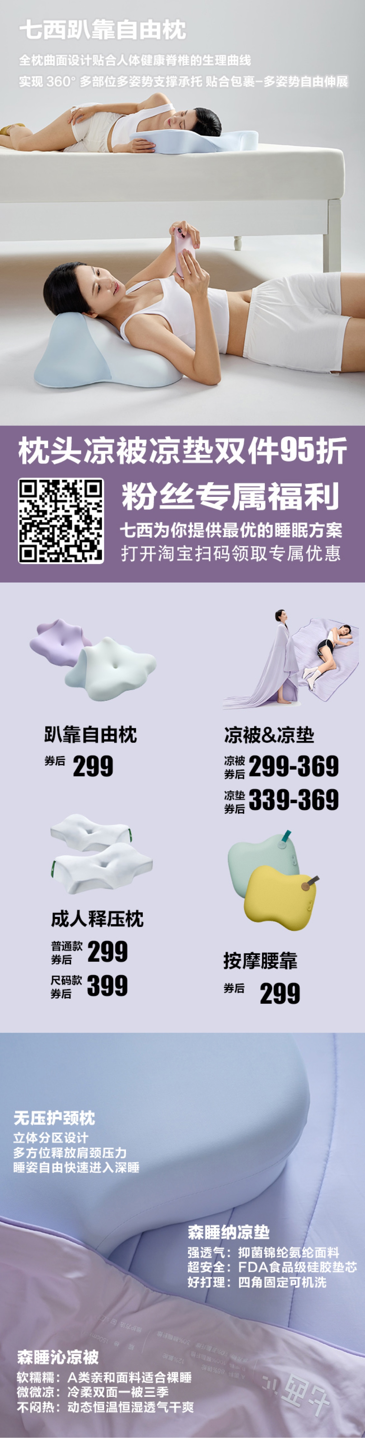 本节目推荐的七西趴靠自由枕,可以适配各种姿势,让人自由躺着靠着甚至是趴着玩手机看书,很适合喜欢葛优躺的手机党,特别是小孩老人用这个对腰椎颈椎很友好。如果喜欢推荐大家试试!另外需要他们家凉被凉垫,枕头,按摩仪优惠的听友们这次也可以领券购买,七西的床上产品对于睡眠都很有帮助。特别是枕头,睡过之后就不想换其他枕头了。人体工学设计对颈椎很友好,睡醒不会脖子酸痛落枕。【想要详细了解我们的使用感受的朋友,请移步34:51,有我们对自由枕的使用感受分享哦!】