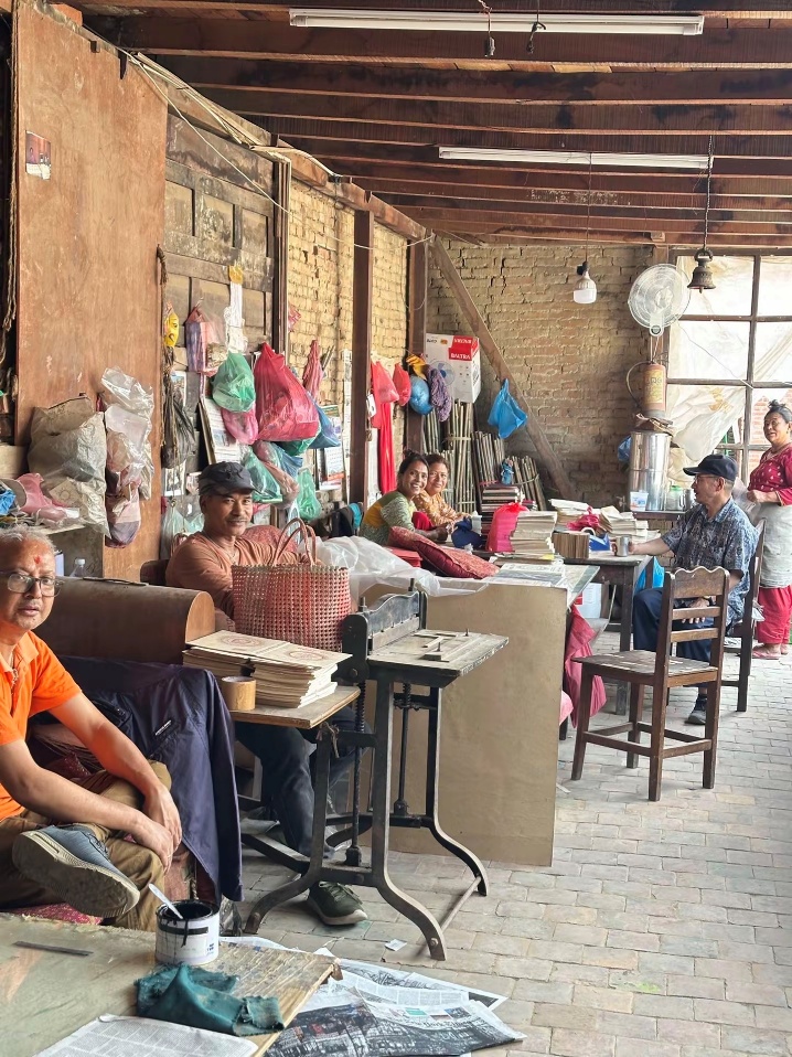 (书店后边的制作车间,在快门按下的时候,这群人们对着我笑了,那本书就随意的摆在这些个桌子上)