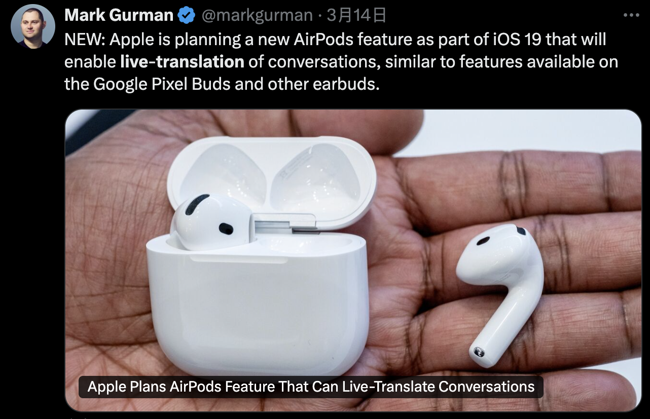 - iOS 19 将上线「实时对话翻译」功能:戴上 AirPods,就能无障碍出国交流。学外语为了旅游的意义,也消失了。