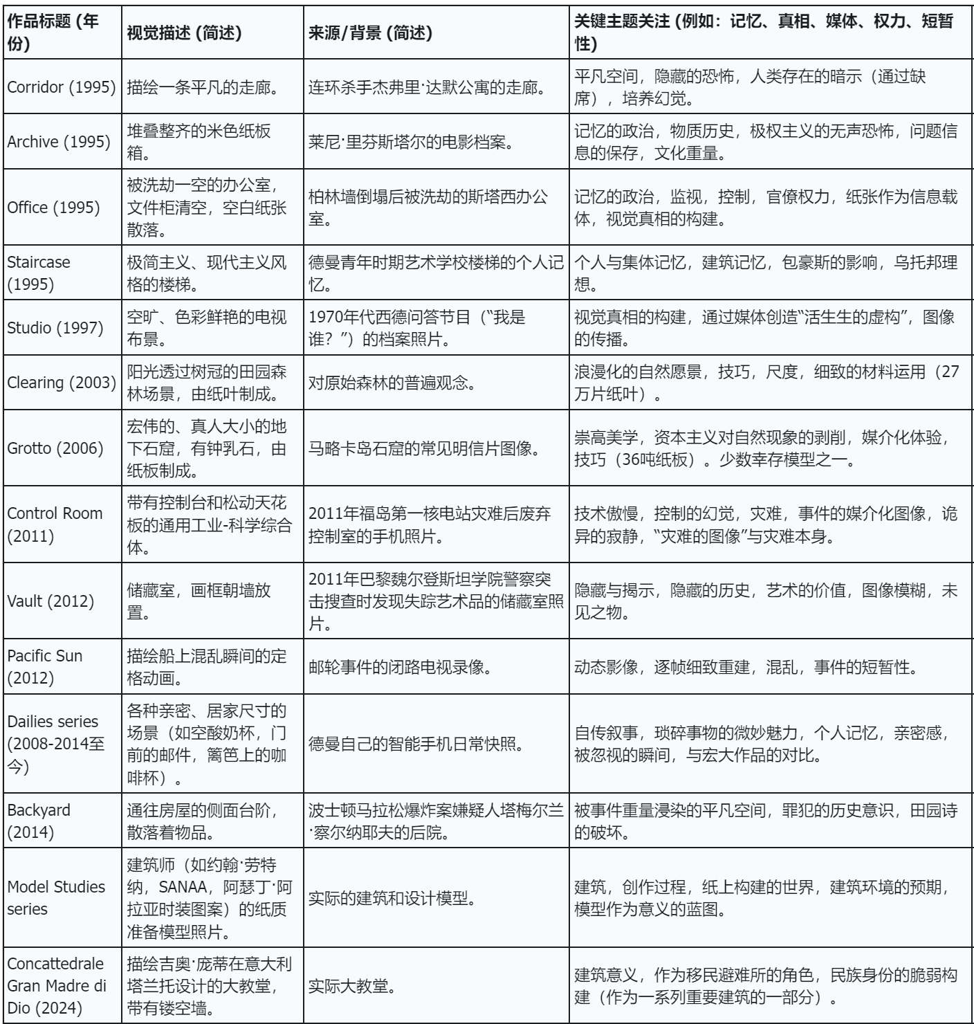 Thomas Demand,一位以纸板雕塑为方法,以摄影为作品输出容器的观念艺术家。他在形式的平滑和概念的展露之间找到了一种恰到好处的距离,为我们揭开 事实再现-图像传播-历史现实 之间的崎岖关系。碎片化的、不完整的记忆无法摆脱偏见的宿命,但亦有希望在一次又一次的再创和观看中被重建,理解和诠释。