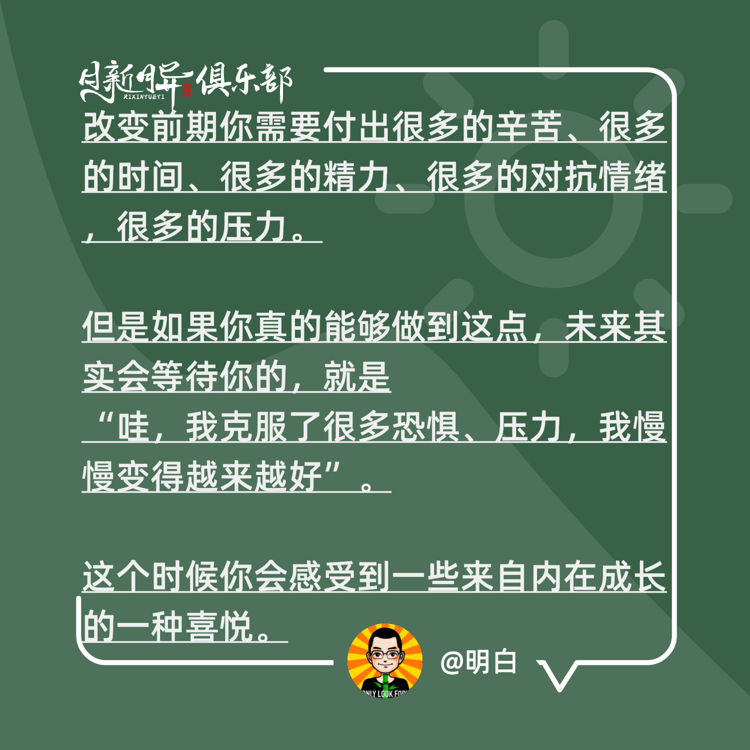 因为改变前期你需要付出很多的这种辛苦、很多的时间、很多的精力、很多的对抗情绪,很多的这种压力,但是如果你真的能够做到这点,未来其实会等待你的,就是“哇,我克服了很多恐惧、压力,我慢慢变得越来越好”。