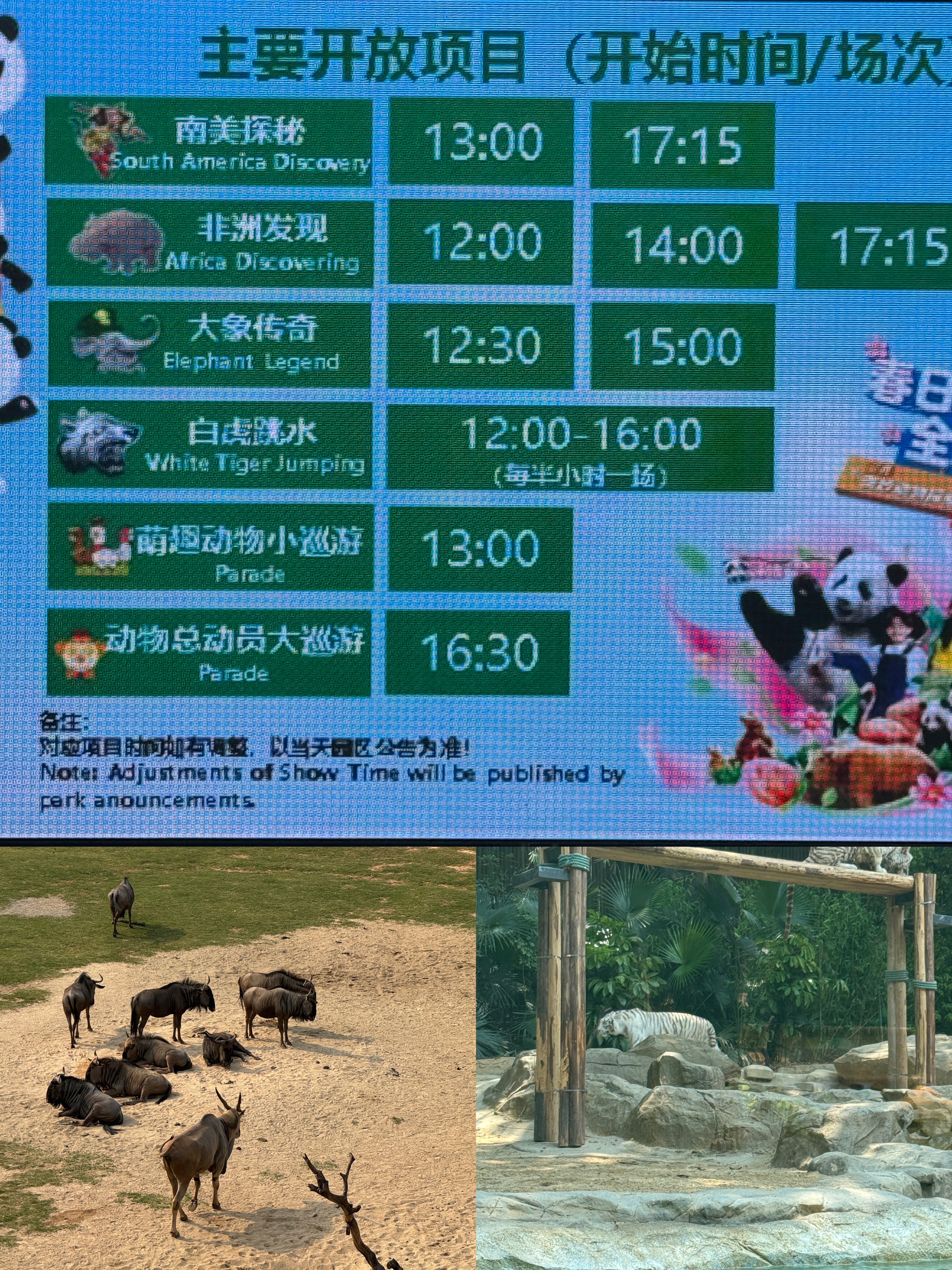 08:23 长隆野生动物园亲体验,几个小tips:租推车、进园没有身份证小童需要家长扫码、白虎跳水墙裂推荐,必看项目!!!进园可带些许补给食物、排队如厕小神器(仅供参考)