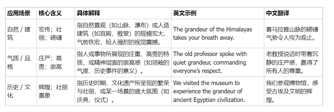 quiet grandeur(沉静的庄严):强调 “不张扬的高贵感”,如人的气质、事物的内敛气场。例:The old castle exudes a sense of quiet grandeur despite its age.译:这座古老的城堡虽历经岁月,却散发着沉静的庄严感。grandeur of character(品格的崇高)例:His selfless dedication showed the grandeur of his character.译:他无私的奉献彰显了品格的崇高。