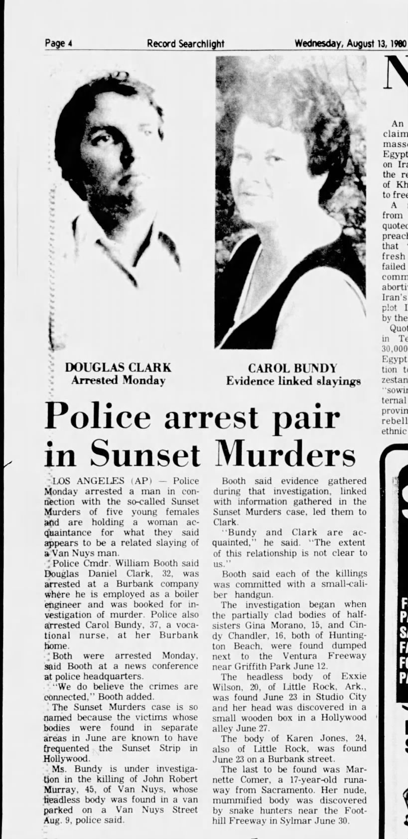 - 警方逮捕两名和日落大道谋杀案有关的嫌犯的报纸报道
