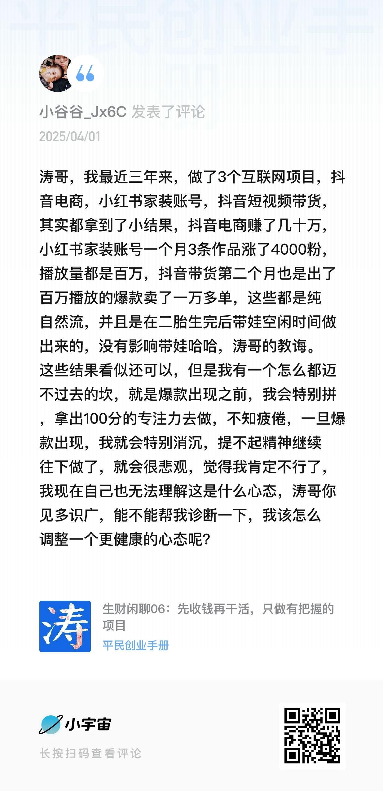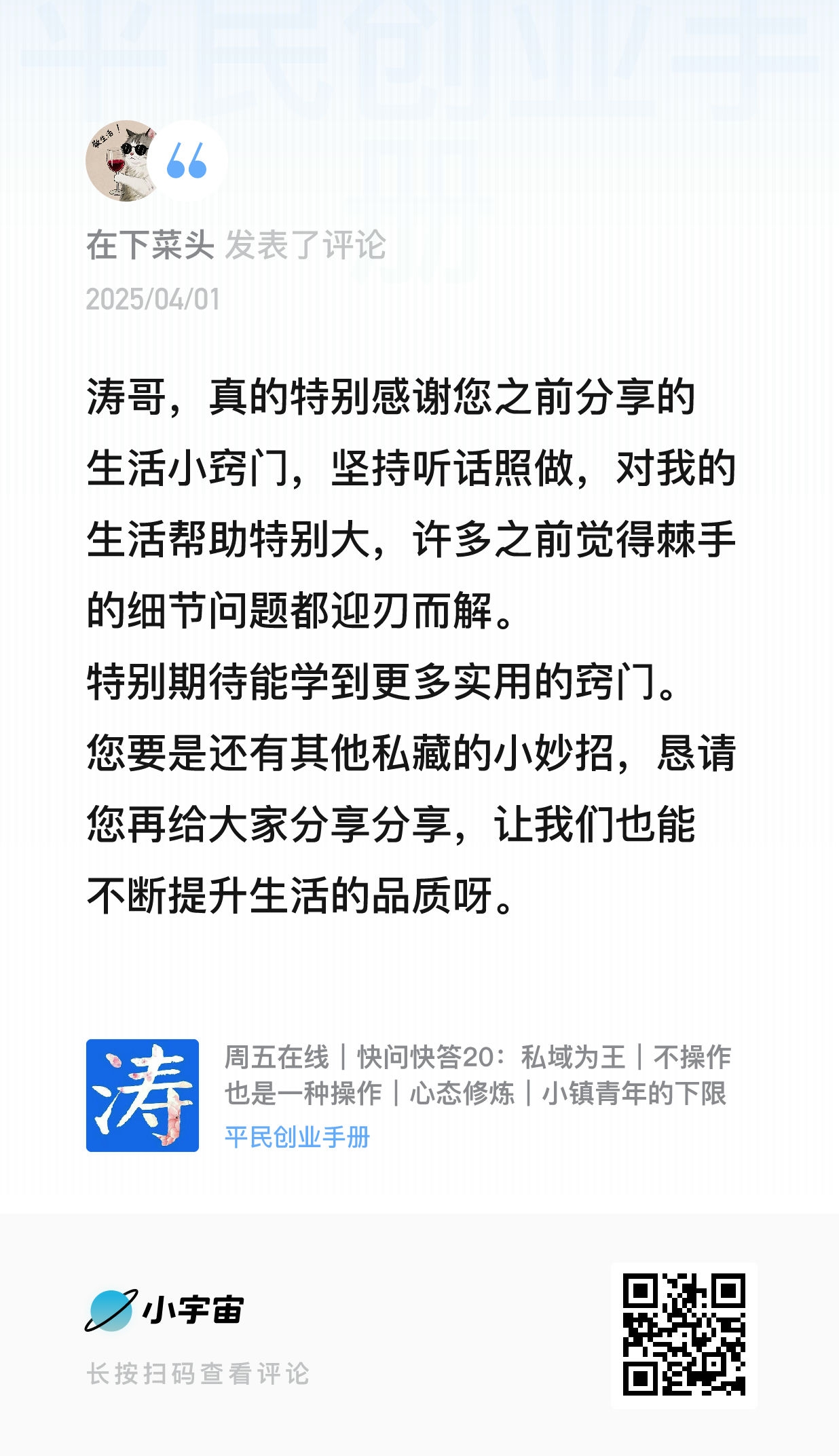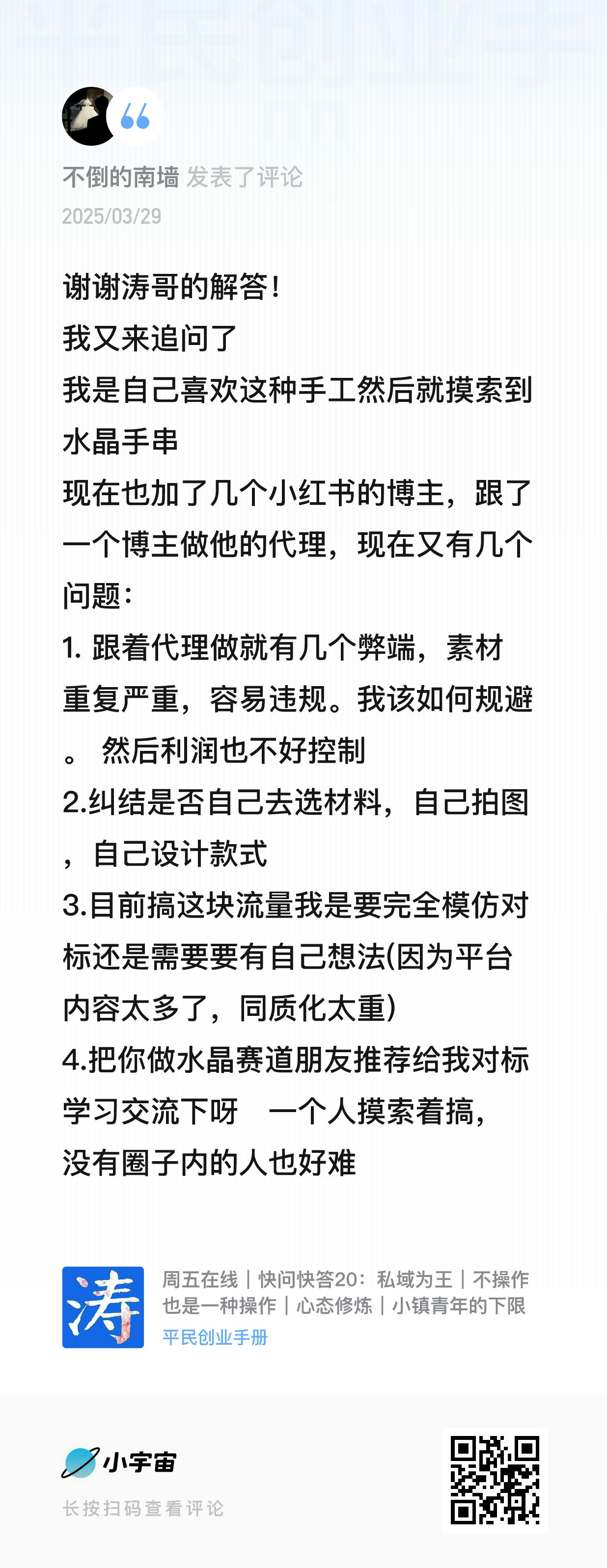 我的微信:xuejieyou6,欢迎撩我,我在「屋里涛说」等你,来星球《平民创业手册》有问必答,