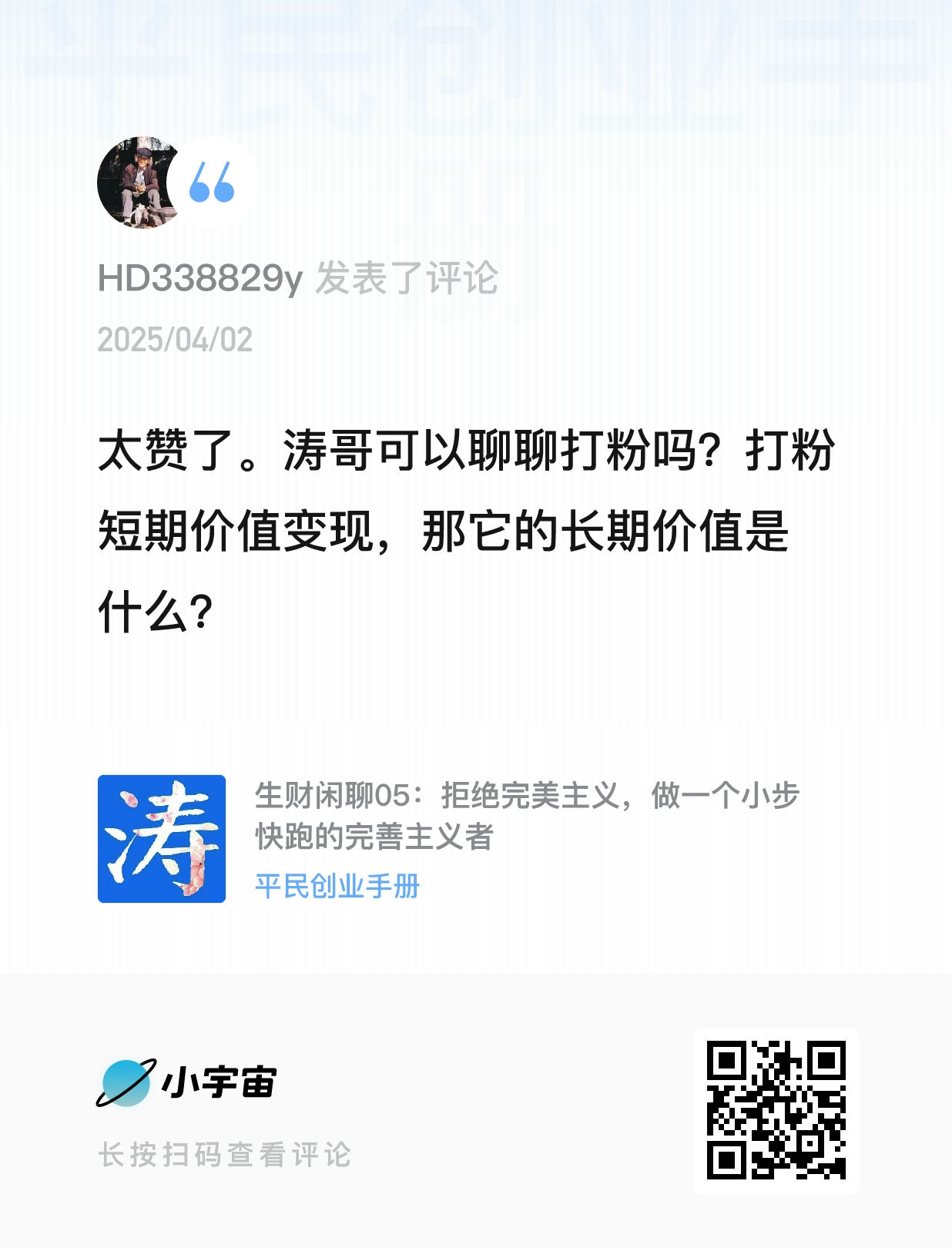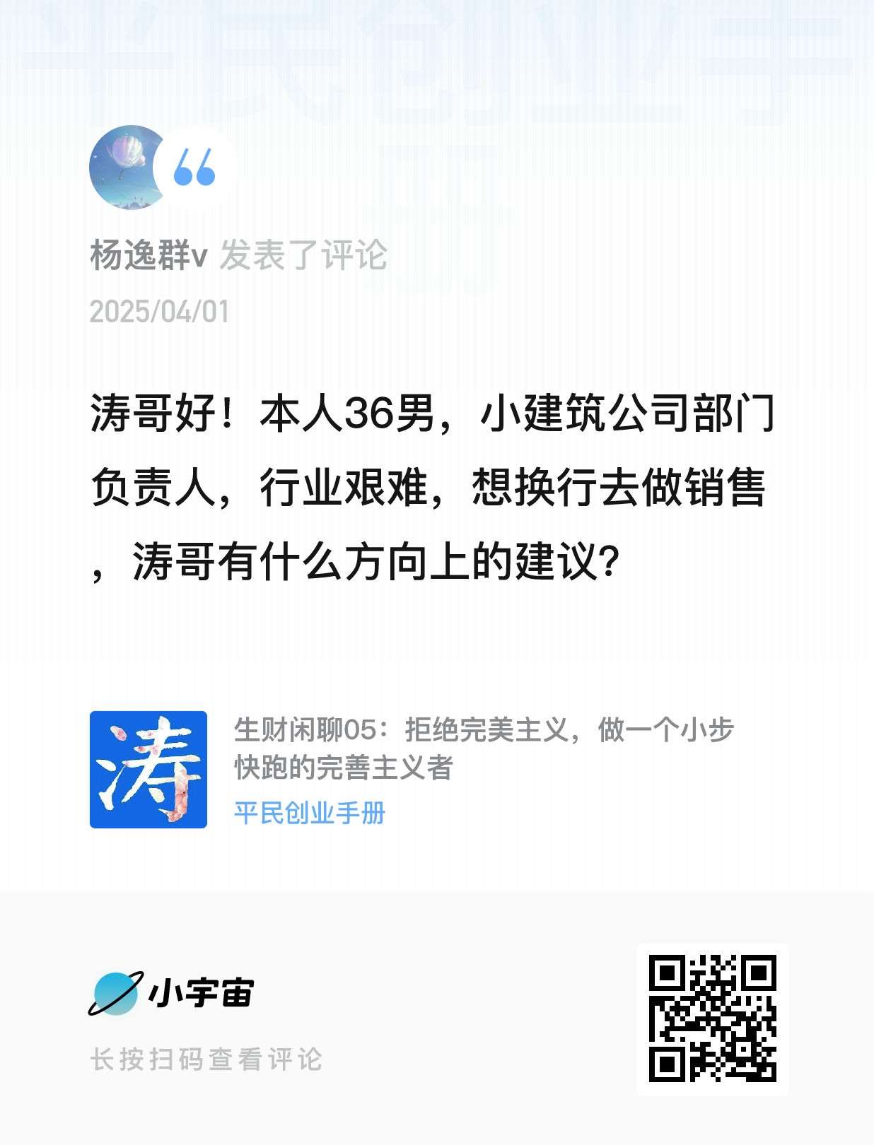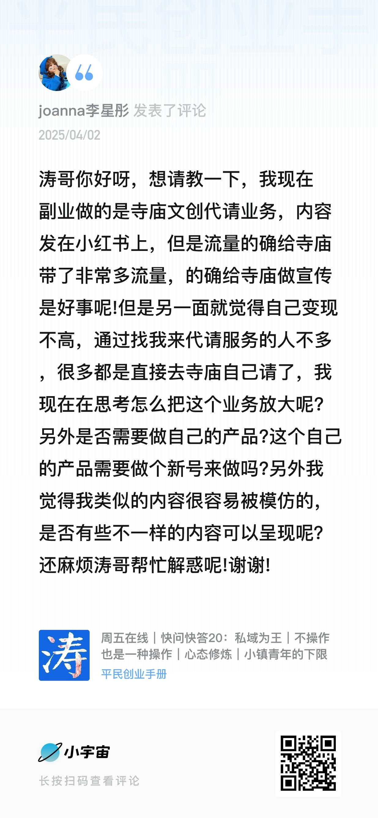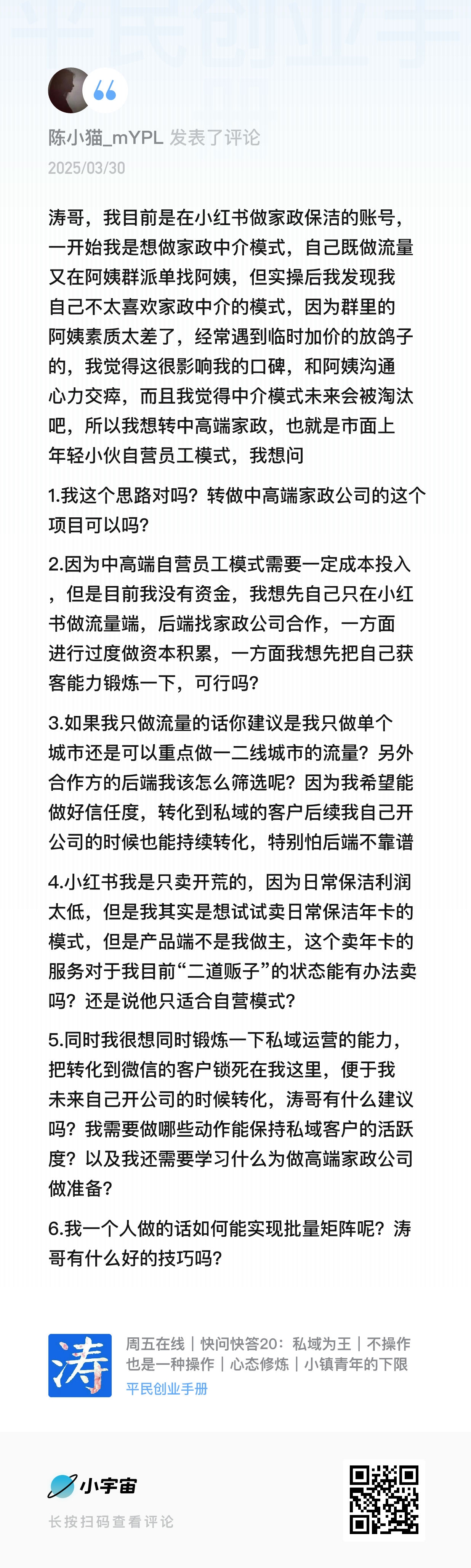 我的微信:xuejieyou6,欢迎撩我,我在「屋里涛说」等你,来星球《平民创业手册》有问必答,