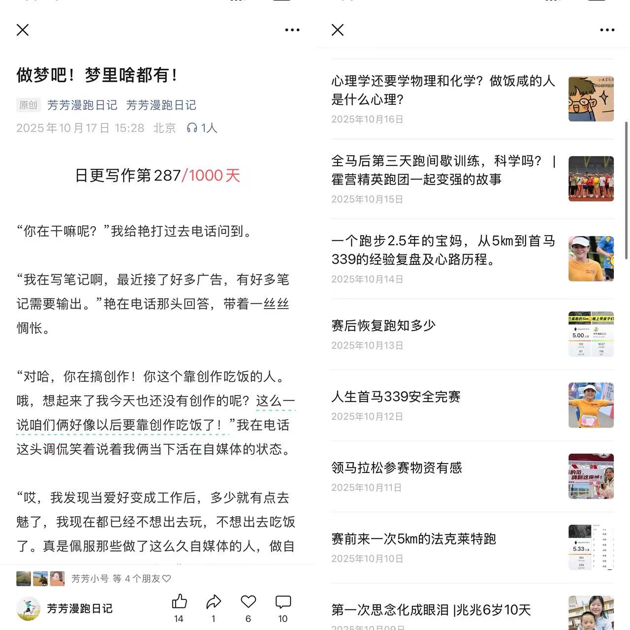 所以,如果你也有写作的欲望,但始终没有行动,我建议你看看芳芳的公众号:芳芳漫跑日记。或者能从中汲取一些朴素的方法和动力。